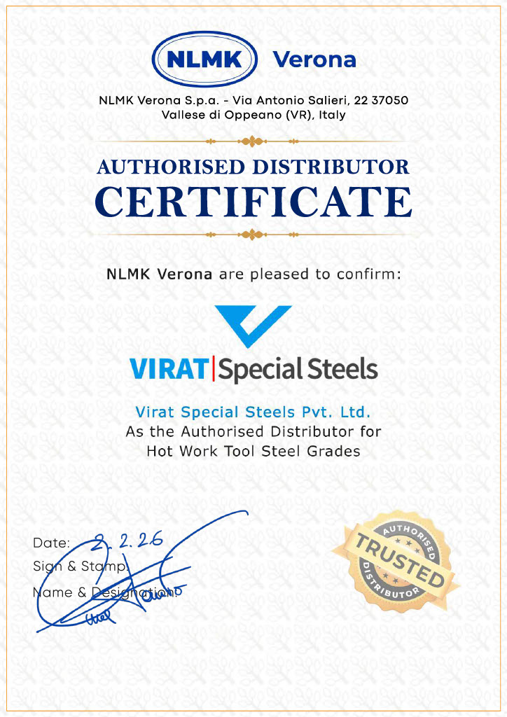 Virat Special Steels Pvt. Ltd. is proud to announce a significant milestone in our journey—official recognition as the Authorised Distributor for Hot Work Tool Steel Grades by NLMK Verona S.p.a., Italy. This milestone, dated 2nd February 2026, marks a new chapter in our commitment to delivering excellence in the steel industry.